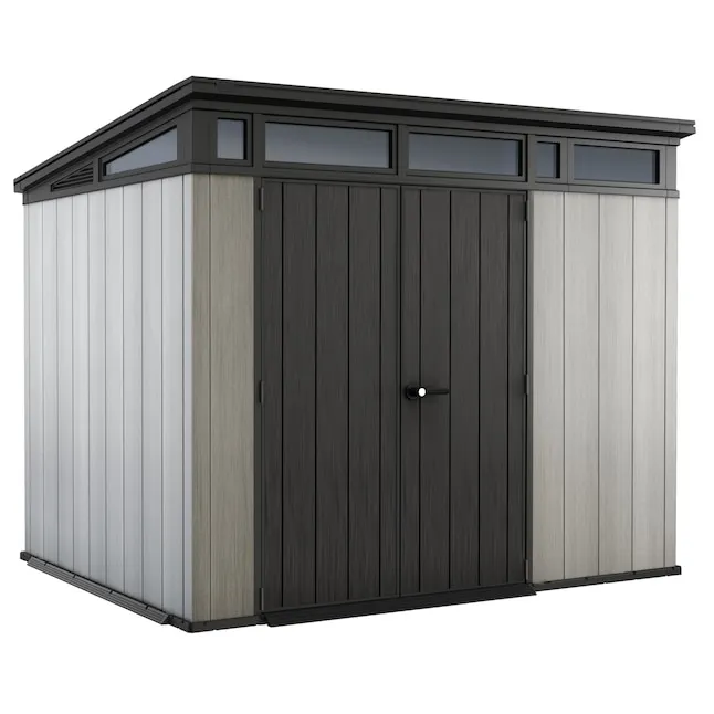 Das Cortina 9 x 7 Gerätehaus hat ein modernes Design mit einem geneigten Dach und Fenstern. Es bietet funktionelle Lagerung mit doppelwandigen Wänden aus dem Verbundmaterial Evotech, das die Optik und Haptik von Holz bietet, aber die Vorteile von Harz hat. Dieser wetterbeständige und wartungsfreie Schuppen rostet, verrottet oder blättert nicht ab. Er verfügt über Stahlverstärkungen für zusätzliche Stabilität, abschließbare Doppeltüren für Sicherheit (Schloss nicht enthalten), zweiseitige Belüftung, ein Dach mit einer Schneelastkapazität von bis zu 150 Kilogramm und einen robusten Boden, der eine Last wie einen Fahrtmähwerk tragen kann.